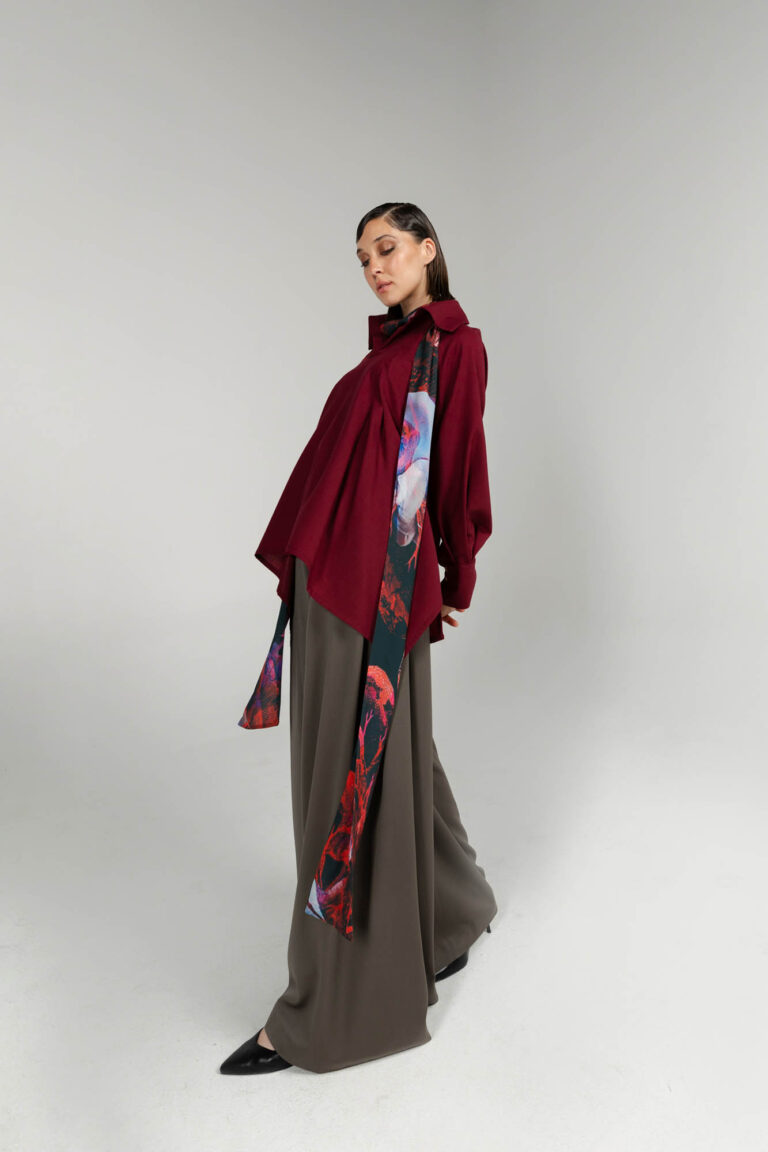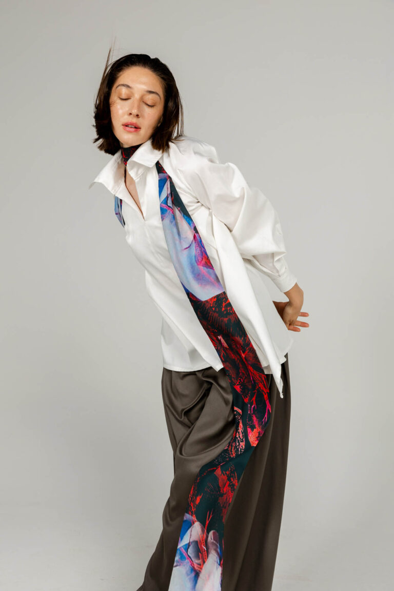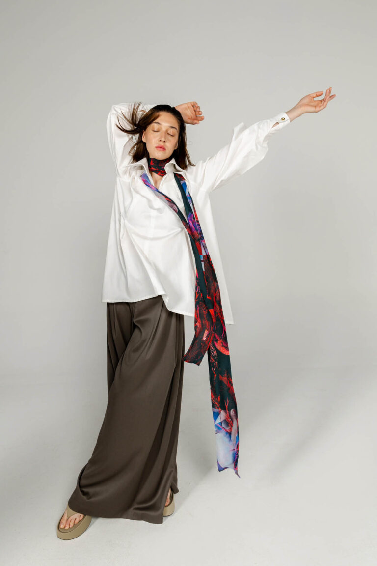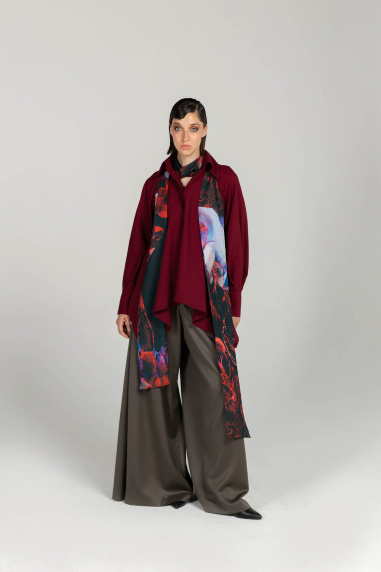 Fluid drape, transparent scarf with our iconic printed material